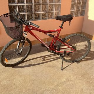 Bicicleta de montaña Rockrider RR 6.0 con suspensión. - Cuadro de color rojo. - Cesta delantera. - Sillín negro. - Ruedas de montaña.