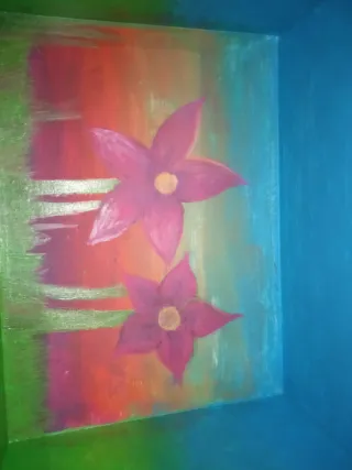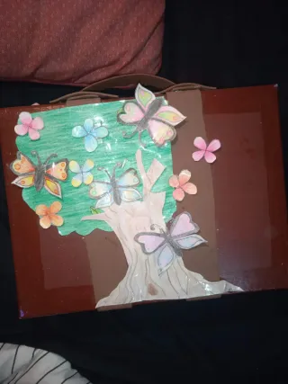 Maleta decorada a mano con un diseño de árbol, flores y mariposas. - Base de maleta marrón. - Dibujo de árbol con tronco y ramas. - Flores de colores. - Mariposas de diferentes tamaños y colores. La hice para gastar tiempo osea está aburrida.