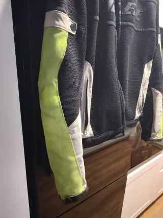 Chaqueta de moto Dainese para verano, con un diseño moderno y funcional. - Paneles de malla para ventilación. - Combinación de colores negro, gris claro y amarillo neón. - Cierre frontal con cremallera y botones a presión en el cuello. - Bolsillos con cremallera en la parte delantera. Talla 54 Con bastante uso y color amarillo algo desgastado, pero aun totalmente funcional y sin rozaduras. Protección en codos y hombros