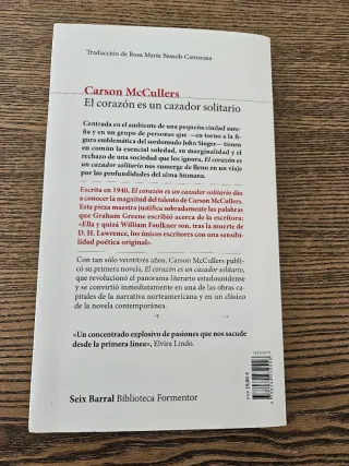 Libro de bolsillo de 386 páginas con letra mediana. Peso: 526 gramos. Esta novela, que fué escrita en 1940 por una joven escritora estadounidense de 23 años, narra la historia de 4 personajes muy distintos (una niña de família obrera numerosa, un médico afroamericano, un obrero dado a la bebida y el dueño de un bar) que tienen en común el hecho de conocer a un hombre sordo que se ha mudado a aquella zona de la ciudad. La autora nos hace profundizar en la condición humana y consigue hacernos vivir los miedos, anhelos e ilusiones de los protagonistas en un ambiente de pequeña ciudad industrial del sur de EEUU. Una obra referente.