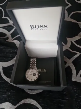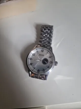 Elegante reloj de pulsera para hombre de la marca Hugo Boss. Apenas usado. Necesita reemplazo de pila. - Esfera blanca con detalles plateados. - Correa de eslabones plateada. - Presentado en su caja original.
