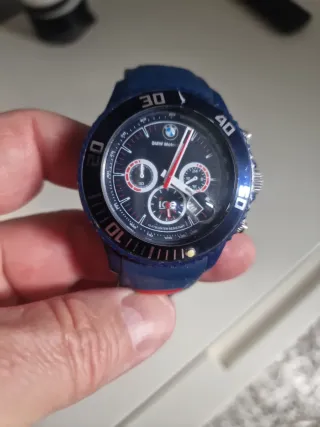 Reloj deportivo BMW Motorrad con diseño llamativo. - Bisel giratorio unidireccional. - Correa de silicona azul con detalles rojos. - Resistente al agua 10 ATM.