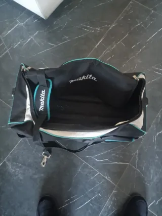Maleta de tela negra con detalles en turquesa y blanco, ideal para transportar herramientas. 70 cm de longitud - Cierre con cremallera. - Asas de mano. - Correa ajustable para hombro.