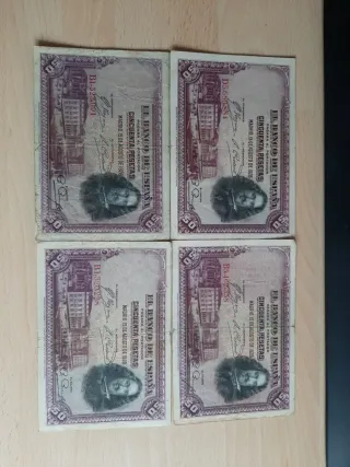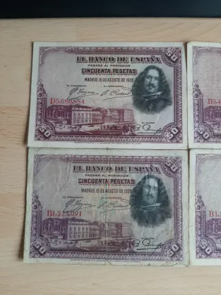 Billetes de 50 pesetas del Banco de España, con fecha de 15 de agosto de 1928. PRECIO POR UNIDAD. Puedes elegir el número que quieras. También acepto intercambios. - n° D5,680,884 - n° B1,323,091 - n° B5,462,338 - n° B1,320,228