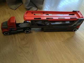 Camión de juguete con remolque transportador de color rojo y gris. - Diseño de camión articulado. - Remolque de dos niveles con rampas.