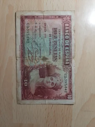Billete de 10 pesetas emitido por el Banco de España en 1935. También acepto intercambio. - Certificado de plata. - De curso legal. - Serie C2. - Número de serie: 597.642. - Grabado en Inglaterra por Waterlow & Sons Ltd.