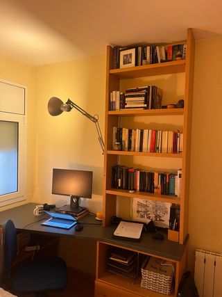 Conjunto de escritorio y estantería, ideal para crear un espacio de trabajo o estudio. - Estructura principal de madera. - Superficie de trabajo amplia. - Estantería con varios niveles para almacenamiento. A recoger en Sant Pol. Lo dejo desmontado.