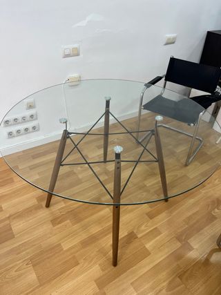 Elegante mesa redonda con sobre de cristal y patas de madera. - Diseño moderno y ligero. - Base con estructura metálica. - Ideal para comedor o sala de estar.