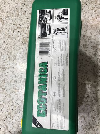 Bidón de la marca Ecótanica, diseñado para el cambio de aceite del motor. Es de color verde y tiene un asa para facilitar su transporte. 6 litros de capacidad - Tapa superior amarilla. - Tapón de vaciado amarillo.