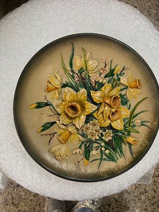 Conjunto de tres platos decorativos con un hermoso diseño floral en relieve. Perfectos para añadir un toque de color y arte a cualquier pared. - Motivo central de narcisos y otras flores. - Tonos beige y amarillos predominantes. - Acabado en relieve. De diametro 29 cm