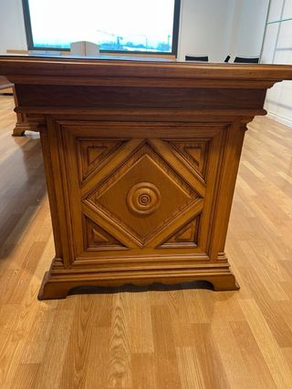 Mesa industrial antigua de roble macizo, procedente de almacén textil familiar. Fabricación aprox. años 30–40 (1938). Pieza auténtica, no decorativa: estructura extremadamente robusta, madera maciza, sin aglomerados. Ideal como mesa de despacho, estudio creativo, arquitectura, tienda o restaurante. Medidas: • Largo: 275 cm • Ancho: 77 cm • Alto: 82 cm Estado: muy bueno para su edad, con pátina original. Muy pesada. Solo recogida en mano. Precio por unidad / se vende el conjunto.