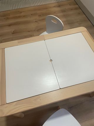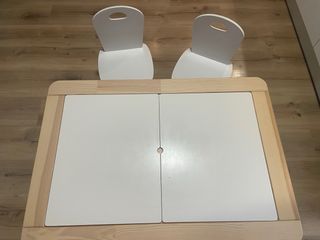 Conjunto de mesa y sillas infantiles, perfecto para que los más pequeños jueguen y aprendan. - Estructura de madera clara. - Superficie de mesa blanca. La mesa dispone de dos espacios bastante grandes para guardar libros,cuadernos,colores.. Lo vendo por desuso. El escritorio y las dos sillas por 100€.