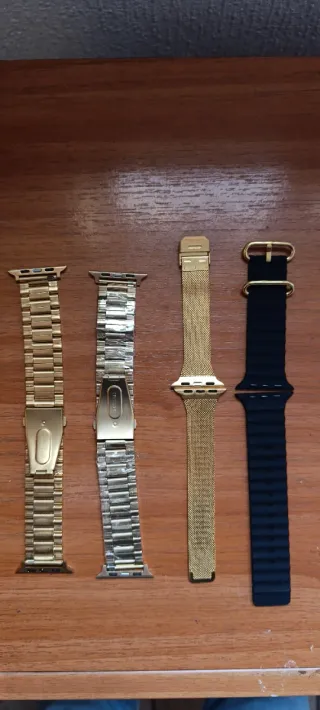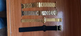 Conjunto de correas para smartwatch en acabados negro y dorado. Incluye diferentes estilos para personalizar tu reloj. - Correa de eslabones dorada. - Correa de malla dorada. - Correa de silicona negra. 5 € cada una están nuevas.