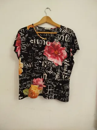 Blusa muy fresca y linda con un diseño llamativo. - Estampado de flores y letras. - Diseño multicolor sobre fondo negro.