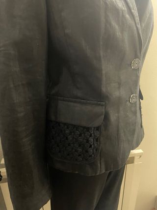 Elegante blazer de la marca Mariella Rosati. Marca italiana de calidad algodón satinado Poco uso - Diseño clásico con solapas. - Cierre de dos botones. - Detalle de encaje en los bolsillos y espalda Talla 42 ver medidas