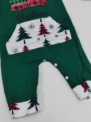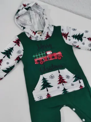 Body de Navidad para bebé 0-6 meses con un divertido diseño. Estampado de camión rojo con Merry Christmas. Mangas y capucha con estampado de árboles de Navidad y copos de nieve. Bolsillo delantero con estampado a juego. Puños y bajos con estampado de cuadros escoceses y árboles.