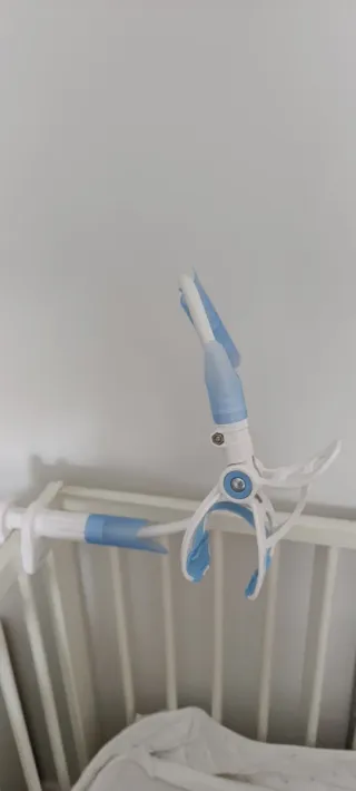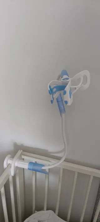 Este soporte flexible se acopla fácilmente a la cuna para colocar la cámara de vigilancia de tu bebé. - Diseño blanco y azul. - Brazo flexible para ajustar la posición. - Se sujeta firmemente a la barandilla de la cuna.