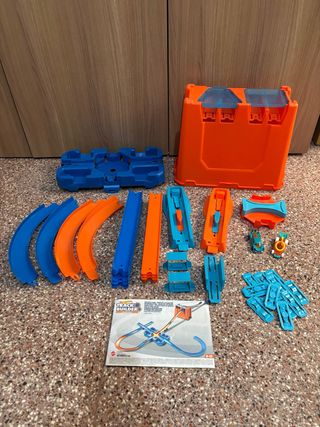 Set de construcción de pistas Hot Wheels. - Incluye piezas de pista en azul y naranja. - Contiene conectores y accesorios. - Incluye dos coches. - Incluye manual de instrucciones.