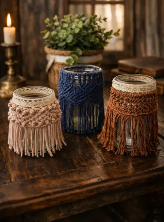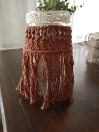 Conjunto de tres botes de cristal decorados a mano . - Diseño artesanal con flecos. - Colores disponibles: rosa palo y beige , azul marino y terracota. - Ideales para velas , macetitas, lápices de colores,brochas de maquillaje etc. Precio unidad 4€ , Lote de 3 tarros por 10€.