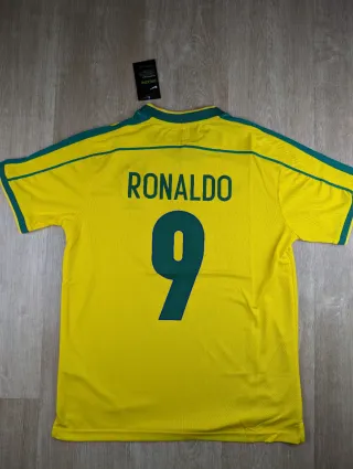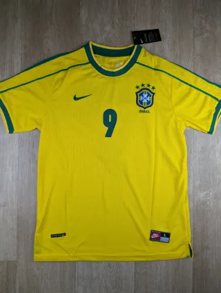 Camiseta de fútbol de Brasil de la temporada 1998, con el dorsal 9 y el nombre de Ronaldo. Talla : L - Diseño clásico amarillo con detalles verdes.