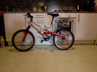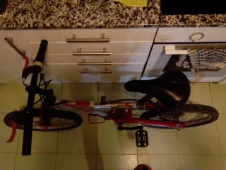 Bicicleta infantil con diseño de Cars. Ideal para los más pequeños. - Cuadro plateado y rojo. - Ruedas todoterreno. - Suspensión delantera y trasera. -cambio de marchas plato pequeño -le falta el freno delantero
