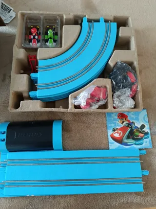 Circuito de carreras Mario Kart de Carrera First. Incluye elementos decorativos para recortar y un circuito con forma de ocho. - Pistas de carreras. - Coches de Mario Kart. - Accesorios decorativos.