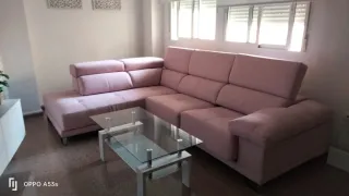 Conjunto de salón con sofá modular de color rosa y mesa de centro. - Sofá modular de 4 plazas. - Tapicería de tela. - Mesa de centro con sobre de cristal. Sofá y salón año imedio como mucho puesto