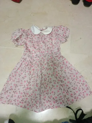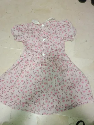 Vestido de manga corta con cuello blanco y estampado floral. - Color base rosa pálido. - Flores pequeñas en tonos rosas y marrones. - Cuello blanco tipo Peter Pan. - Mangas abullonadas. Nancy,barriguitas, Barbie, gijoe, Rosaura,famosa,juguetes antiguos, cinexin, Scalextric,patabollo, jesmar, muñecas repollo,Playmobil,Lego, años 80,años 70,