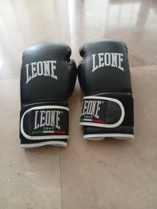Par de guantes de boxeo de la marca Leone en color negro. Presentan el logo de la marca en la parte superior y en la muñeca. - Diseño clásico. - Cierre de velcro. - Detalle de los colores de la bandera italiana en la muñeca. Sólo para vender a gente de la zona de Alicante