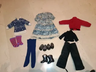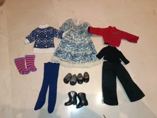 Conjunto de ropa para muñeca Nancy. - Vestido azul y blanco con estampado floral. - Jersey azul y blanco de punto. - Chaqueta roja. - Pantalón y blusa negra. - Calcetines a rayas moradas y rosas. - Medias azules. - Zapatos negros. - Botas negras. Nancy, barriguitas, Barbie,gijoe, Rosaura,famosa, juguetes antiguos, cinexin,Scalextric, patabollo,jesmar, muñecas repollo,Playmobil,Lego,años 80,años 70,
