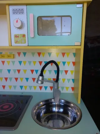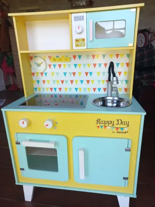 Divertida cocina de madera de la marca Janod, modelo Happy Day. Ideal para que los más pequeños jueguen a cocinar. - Fabricada en madera. - De buena calidad. - Diseño colorido y alegre. - Incluye accesorios como horno, fogones y fregadero. - Incluye utensilios de cocina varios.