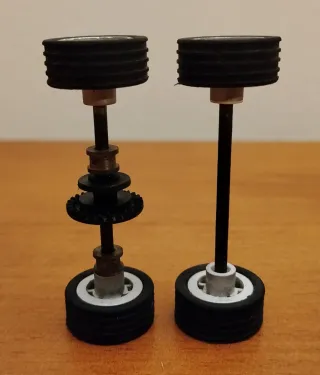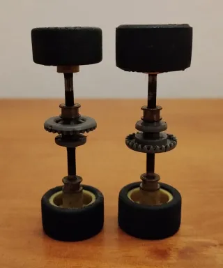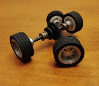 Conjunto de ejes y llantas completos para coche a escala 1:32.
