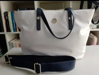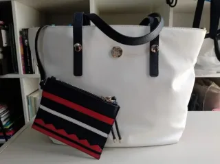 Bolso de mano Tommy Hilfiger con un diseño moderno y llamativo. - Combinación de blanco con detalles en azul marino y rojo. - Incluye un neceser a juego con rayas. - Asa de mano en color azul marino.