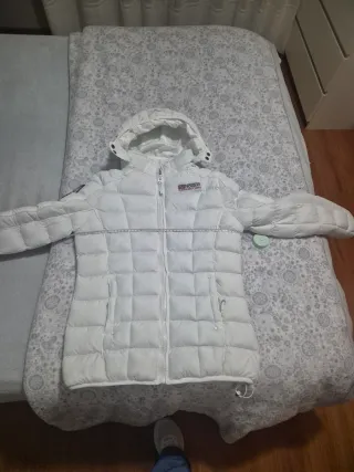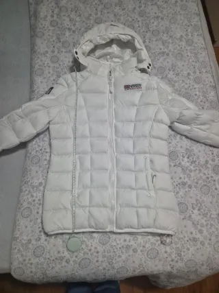 Chaqueta acolchada de Geographical Norway en color blanco. Diseño moderno y funcional. Abriga muchisimo. Se puede lavar a maquina. Cms de sisa a sisa: 52 cm. Puesta 3-4 veces. - Capucha desmontable - Cierre de cremallera frontal. - Bolsillos laterales con cremallera. - Cordón ajustable en el bajo.