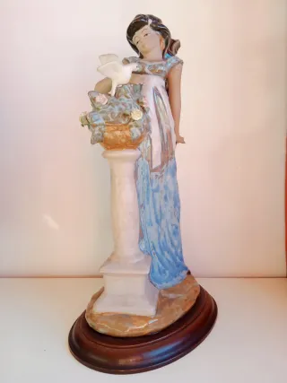 Elegante figura decorativa de porcelana que representa a una mujer con un cesto de flores y un ave. - Detalle de rosas en el cesto. - Base de madera oscura. - Acabado brillante en el vestido. - 20 cm la base por 35 cm alto.