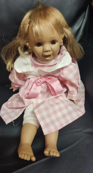 Muñeca Berjuan estilo Reborn, con detalles realistas. - Cuerpo de vinilo. - Pelo rubio. - Vestido de cuadros rosa y blanco.