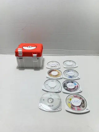 Se vende caja para PSP con capacidad para varios UMD, junto con 12 juegos. NBA 08 Fifa 08 Fifa 09 Fifa 10 Fifa 13 SmackDown VS. Rae UFC undisputed 10 Motorstotm artic Edge - Caja de almacenamiento para PSP. - Incluye 8 UMDs de juegos.