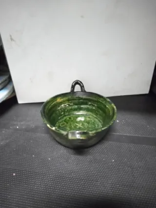 Cuenco decorativo de cerámica con un diseño rústico y un asa. - Color verde con detalles en negro. - Material de cerámica.