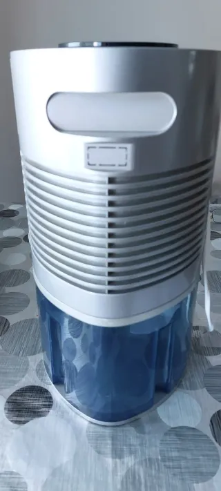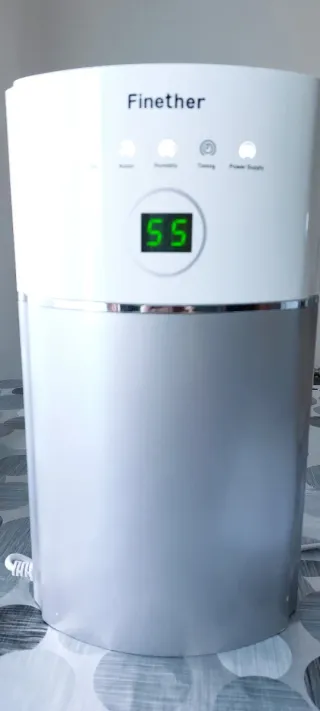 Deshumidificador Finether en acabado plateado y blanco. - Diseño moderno y elegante. - Indicadores luminosos para diferentes funciones.