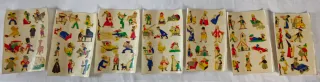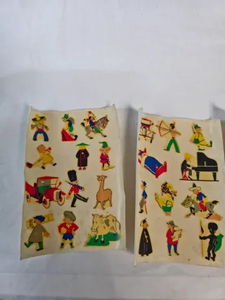 Colección de pegatinas antiguas de la marca Ortega. Cada hoja presenta ilustraciones detalladas y coloridas. 7 páginas - Variedad de personajes y escenas. - Ideal para coleccionistas.