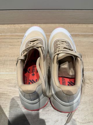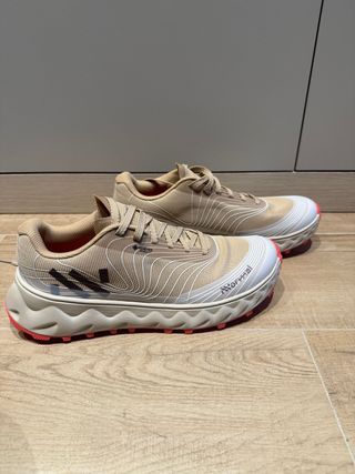 Zapatillas de trail running con tecnología Gore-Tex, listas para estrenar. Su diseño combina tonos beige y detalles en rojo, ofreciendo un estilo moderno y funcional. - Membrana Gore-Tex Invisible Fit. - Suela con buen agarre. - Cierre con cordones.