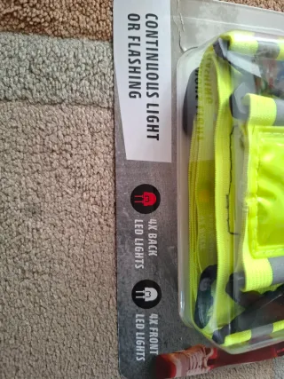 Chaleco de alta visibilidad con luces LED, ideal para actividades al aire libre. - 4 luces LED frontales. - 4 luces LED traseras. - Modos de luz: continua o intermitente. - Diseñado para destacar al caminar, correr o ir en bicicleta. Usa 2 pilas CR2032 NO INCLUIDAS. #Tráfico. Coche. Seguridad. Baliza. Runner. Deporte. Caza. Ciclismo. Senderismo. Ruta. Excursión. Supervivencia.