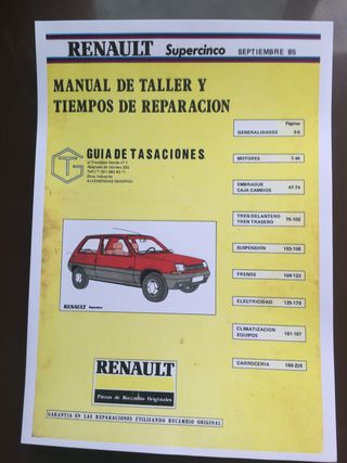 RENAULT Súpercinco gt turbo manual talle Manual de reparación y taller para Renault 5 Súpercinco para todos los modelos gasolina gtl gts y gt turbo Para reparar y mantener el motor caja de cambios frenos embrague eje delantero trasero amortiguadores equipos eléctricos esquema instalación eléctrica carroceria Duplicado del manual para trabajar en taller con el que se reparaba en los talleres de la epoca este tipo de coches. Se hacen envios por wallapop gls e impost a canarias por correos segun tarifas vigentes envios a Portugal e Italia