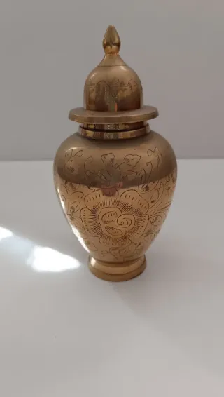 Elegante tibor de latón con un intrincado grabado floral. Su diseño clásico lo hace una pieza decorativa llamativa. - Material: Latón - Diseño: Grabado floral detallado