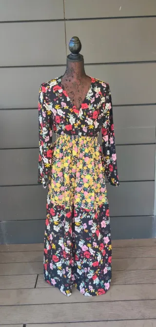 Vestido largo con estampado floral vibrante. Presenta un diseño con escote en V y mangas largas, muy veraniego en varios tonos, con tres botones forrados de la misma tela y la cintura es de nido de abeja por lo que da talla, medidas de sisa a sisa 53 cms, cintura 40, pero da hasta 53 ya que es elástico y de largo 137 cms,talla L, medidas de sisa a sisa 55CMS, da hasta una 110 de pecho y largo desde el hombro 83. Nuevo con etiquetas . Preguntame si te gusta - Cintura elástica para un ajuste cómodo. - Falda con vuelo y estampado mixto.