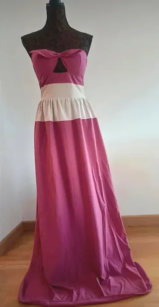 Elegante vestido largo sin tirantes con un diseño bicolor, va entero forrado en el mismo color buganvilla ,palabra de honor en el pecho lleva unas cazuelas que se pueden quitar y lleva una bonita lazada tiene una pequeña abertura y debajo del pecho va ajustado, lleva una cremallera lateral escondida, talla única, y de sisa a sisa son 44 cm , debajo del pecho da un contorno de hasta 80 cms,largo desde el pecho da una largura hasta de 130cms,nuevo con etiquetas - Detalle de lazo en el escote. - Corte imperio con fajín. - Falda larga y fluida.