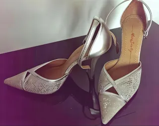 Elegantes sandalias de piel con un diseño sofisticado. Puestos en una ocasión para una sesión de fotos. - Acabado en piel. - Combinación de colores beige y plateado. - Detalle de tiras cruzadas en la parte delantera. - Cierre de pulsera al tobillo.