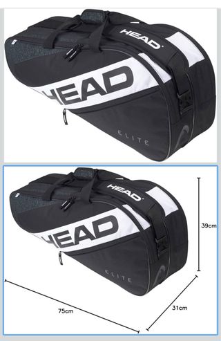Bolso para palas de pádel de la marca HEAD, modelo Elite. - Color negro con detalles blancos y grises. - Diseño moderno y deportivo. - Incluye etiqueta original.
