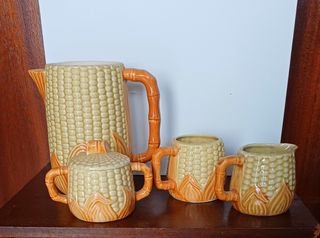 Conjunto vintage de cuatro piezas de cerámica portuguesa con diseño de piñas de maíz. Son piezas de los años 60 hechos en cerámica vidriada (jarra, taza, azucarero y lechera) inspiradas en formas vegetales.y en tonos amarillos y verdes. En su base tienen el número de muestra que son (20.450). En perfecto estado pero la jarra no tiene tapa. - Jarra - Azucarero con tapa - Lechera - Taza