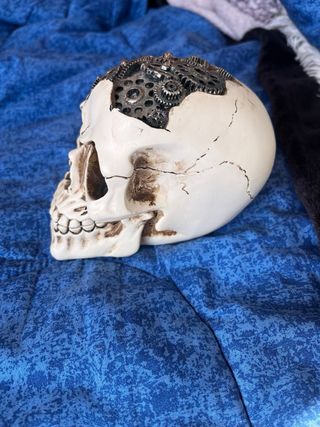 Calavera decorativa con un diseño Steampunk único. Añade un toque original a tu espacio. - Detalles mecánicos de engranajes en la parte superior. - Acabado envejecido.